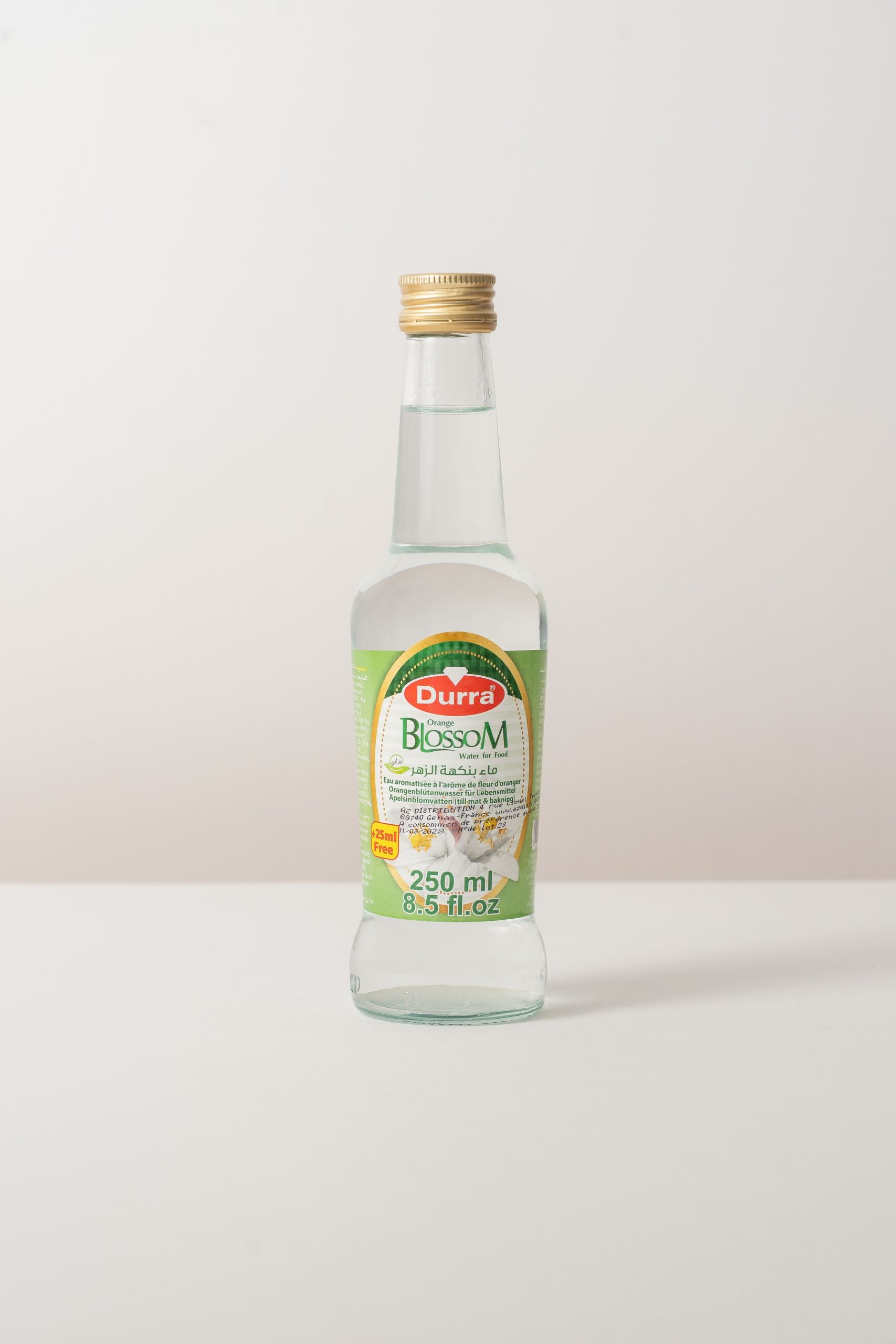 Agua con esencia de azahar, utilizado primariamente para aromatizar postres pero solo tu imaginación te limita, también se puede poner en bebidas como limonada o zumo o cocteles para un toque floral!