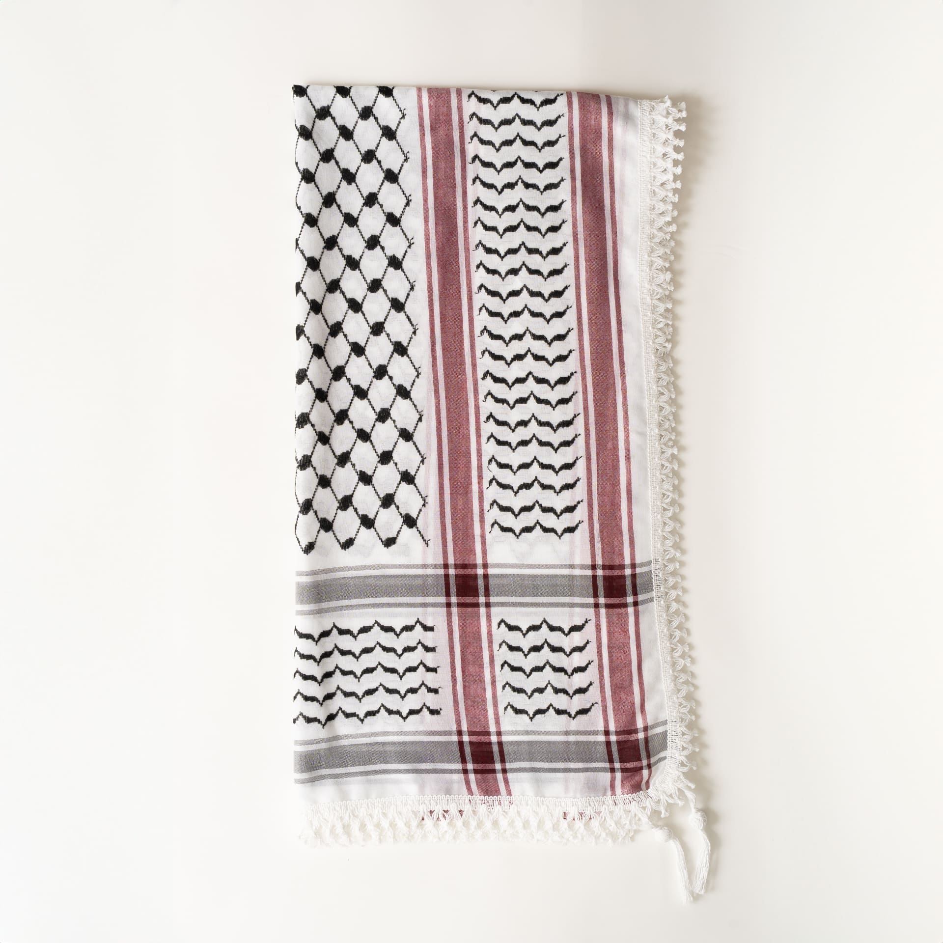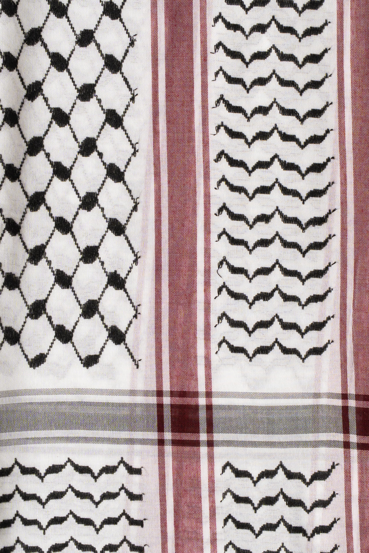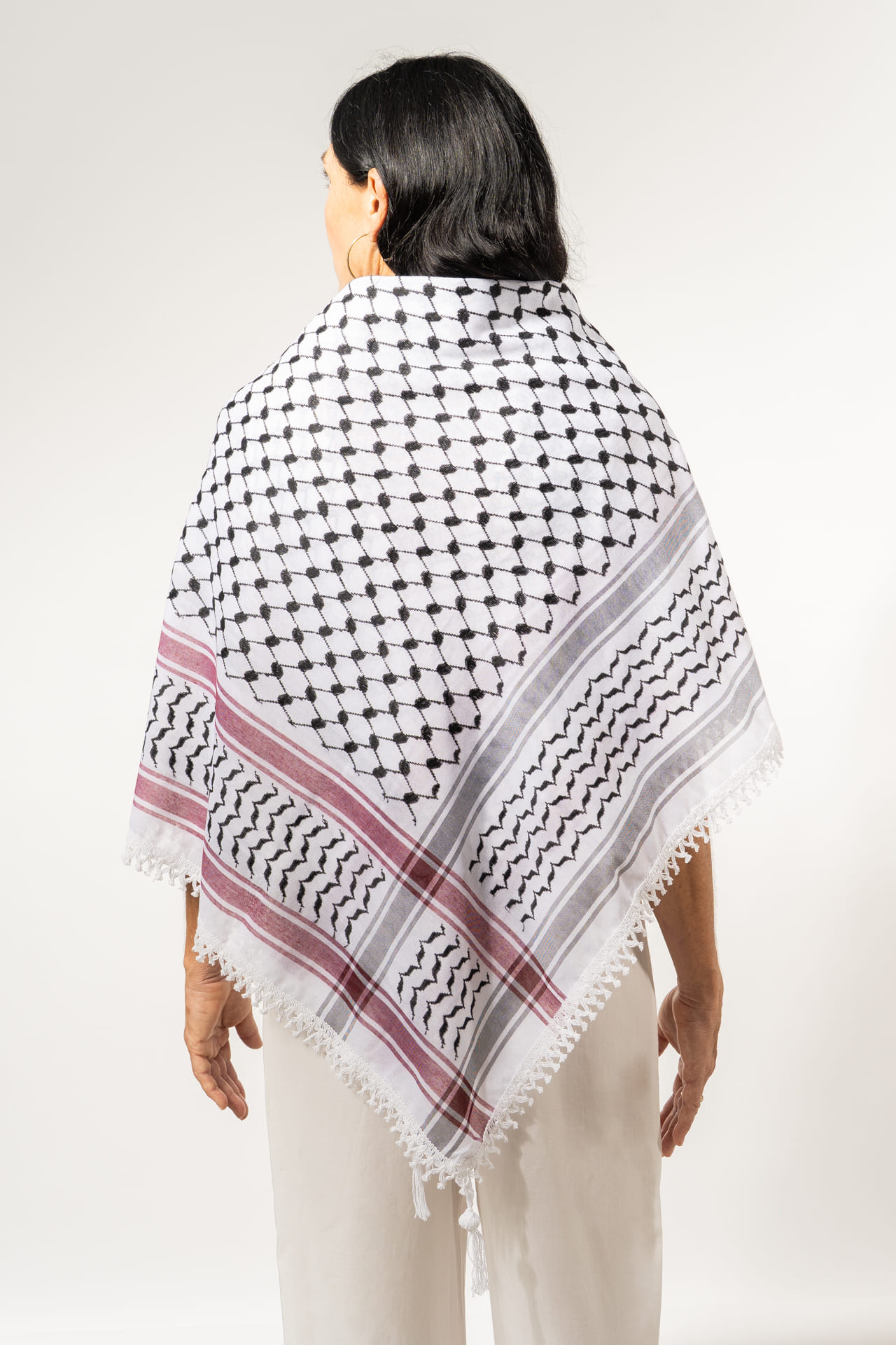 La kufiya (también conocida como kuffiyeh o hatta) es el pañuelo tradicional palestino, usado durante siglos para protegerse del sol, el frío y la arena del desierto. Desde los años 60 se ha convertido en un símbolo mundial de resistencia y apoyo al pueblo palestino. Su diseño encierra un profundo significado: