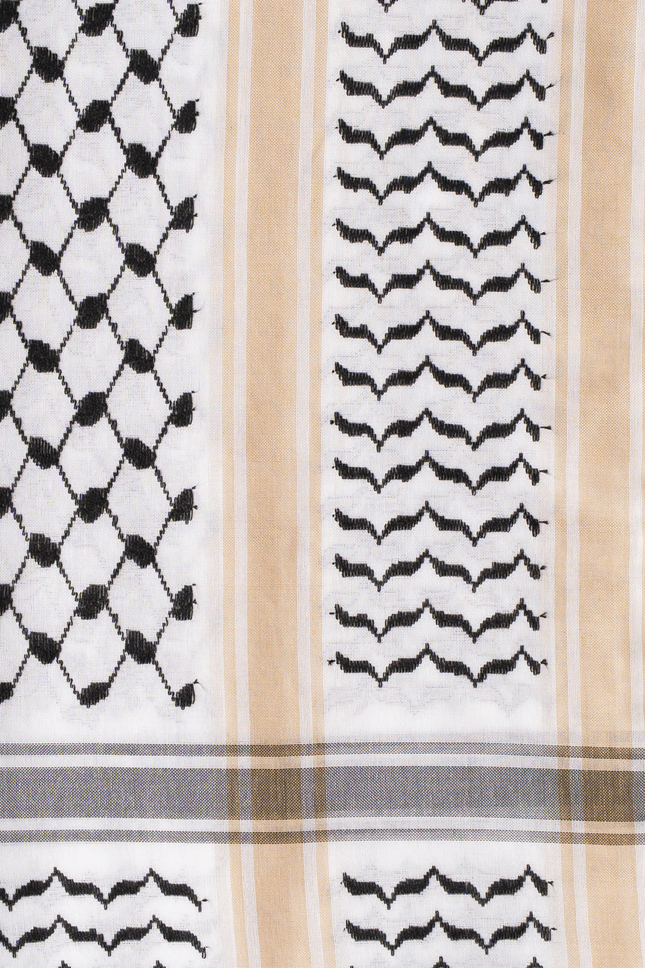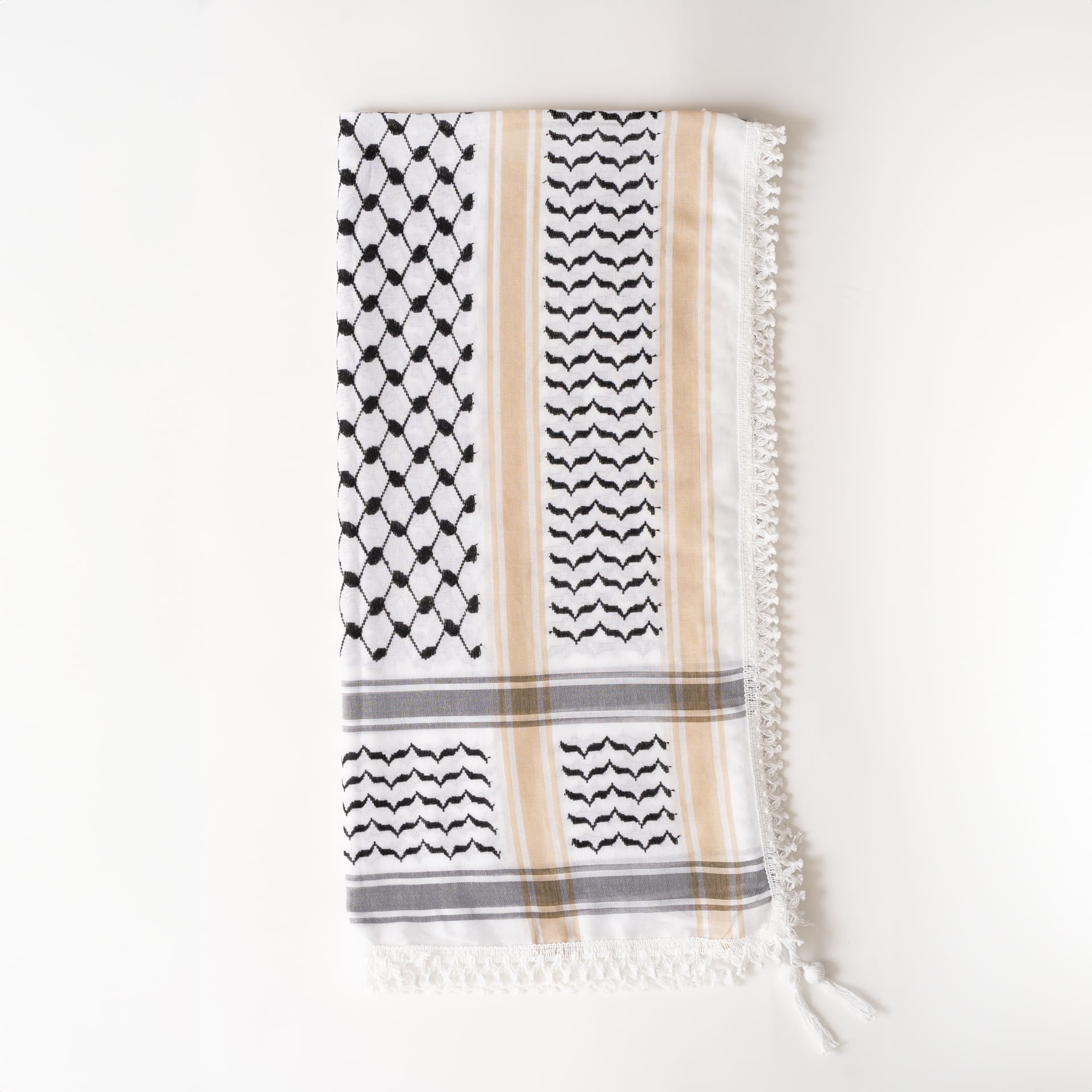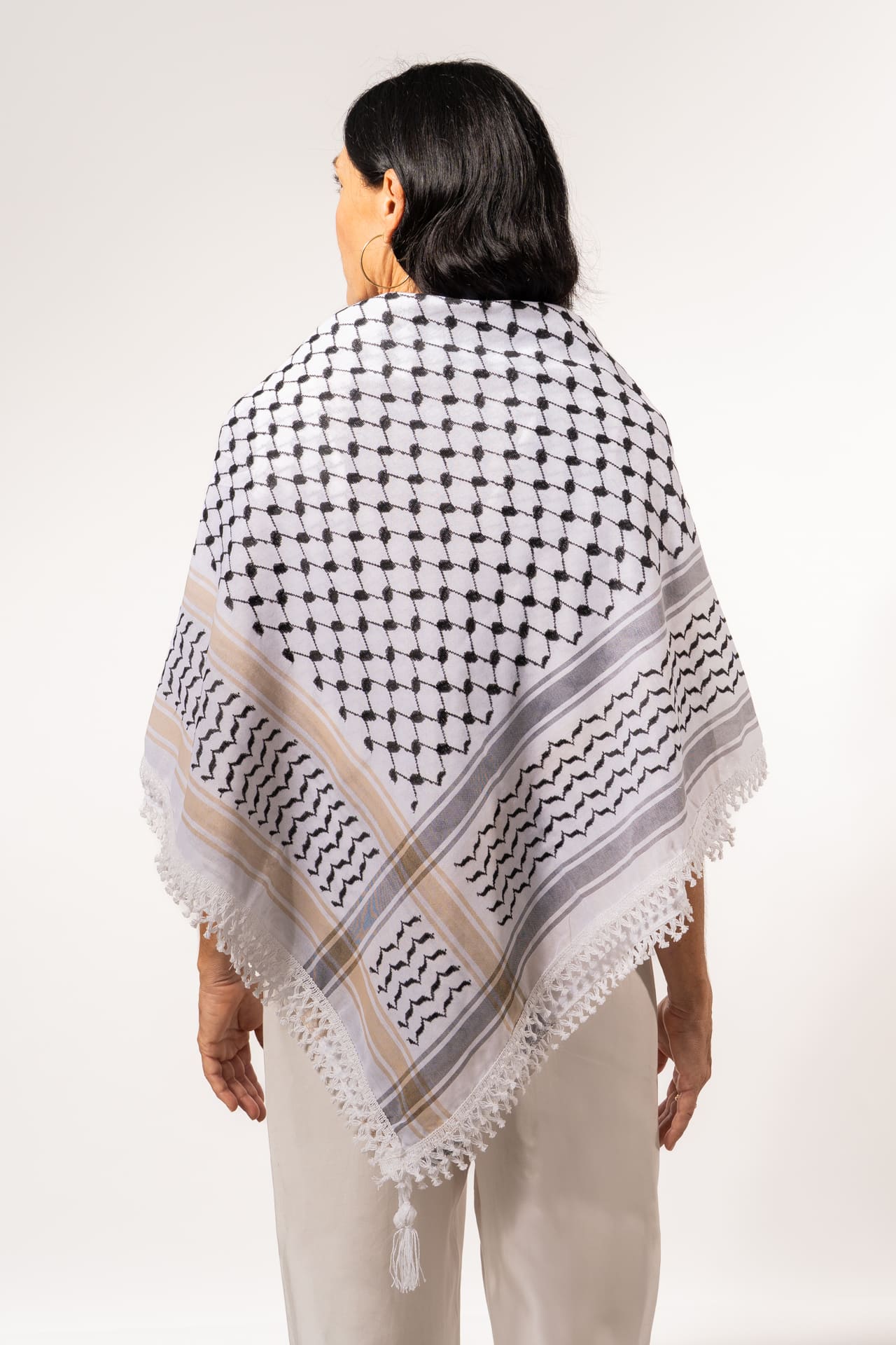La kufiya (también conocida como kuffiyeh o hatta) es el pañuelo tradicional palestino, usado durante siglos para protegerse del sol, el frío y la arena del desierto. Desde los años 60 se ha convertido en un símbolo mundial de resistencia y apoyo al pueblo palestino. Su diseño encierra un profundo significado: