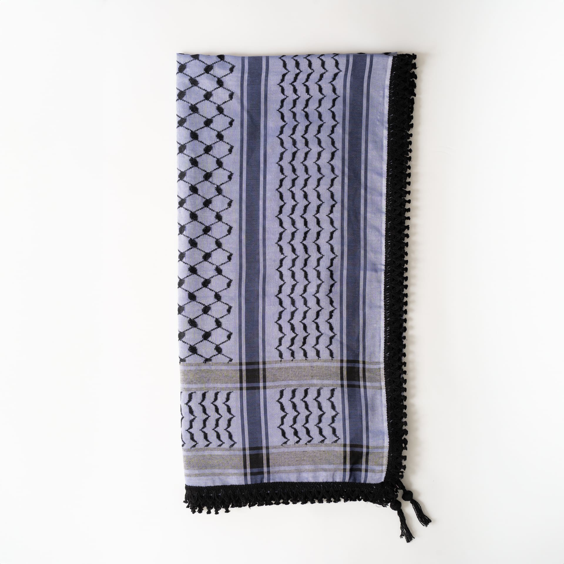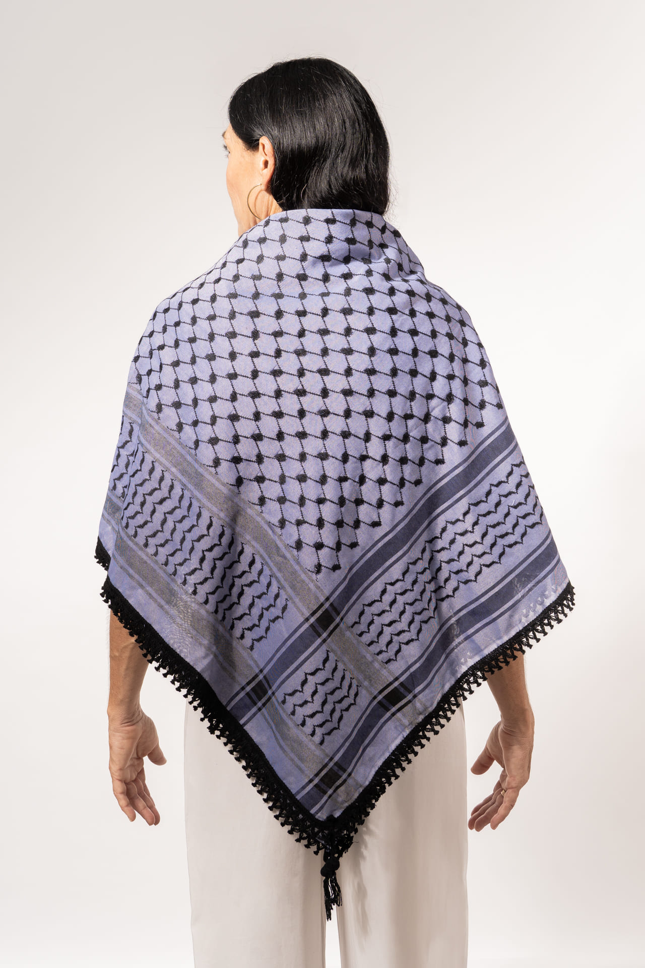 La kufiya (también conocida como kuffiyeh o hatta) es el pañuelo tradicional palestino, usado durante siglos para protegerse del sol, el frío y la arena del desierto. Desde los años 60 se ha convertido en un símbolo mundial de resistencia y apoyo al pueblo palestino. Su diseño encierra un profundo significado: