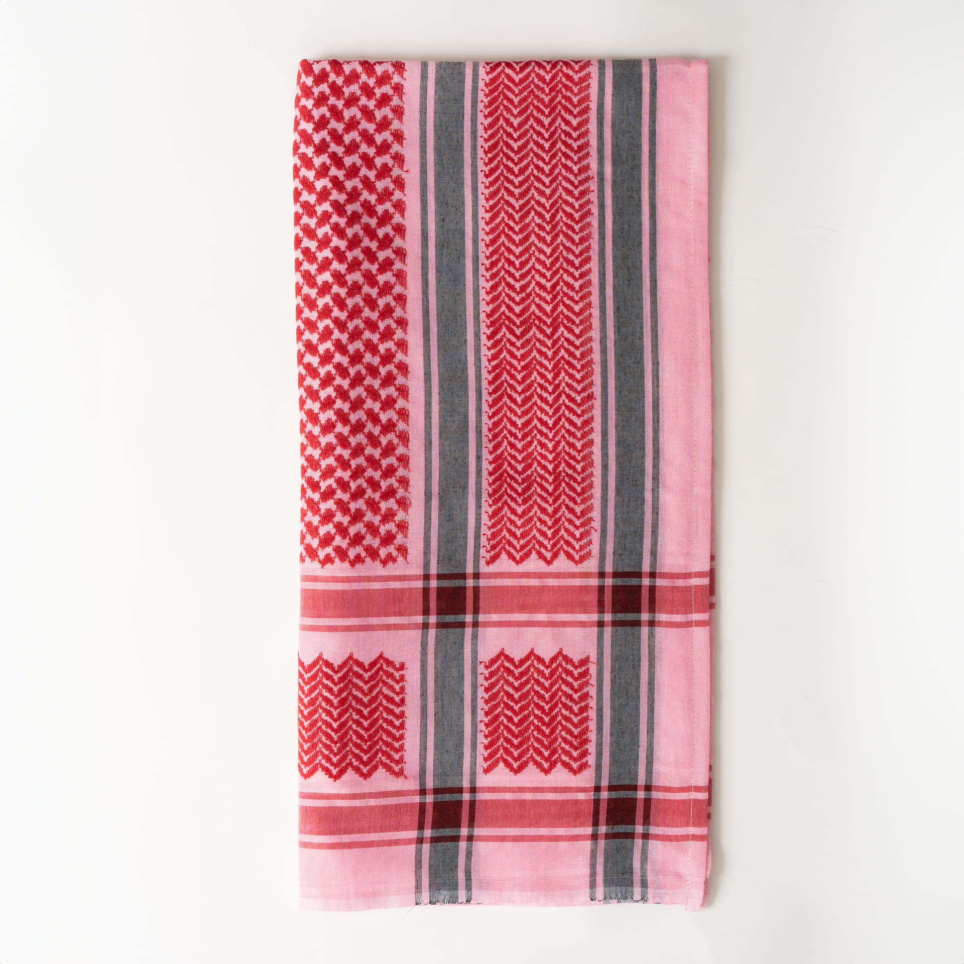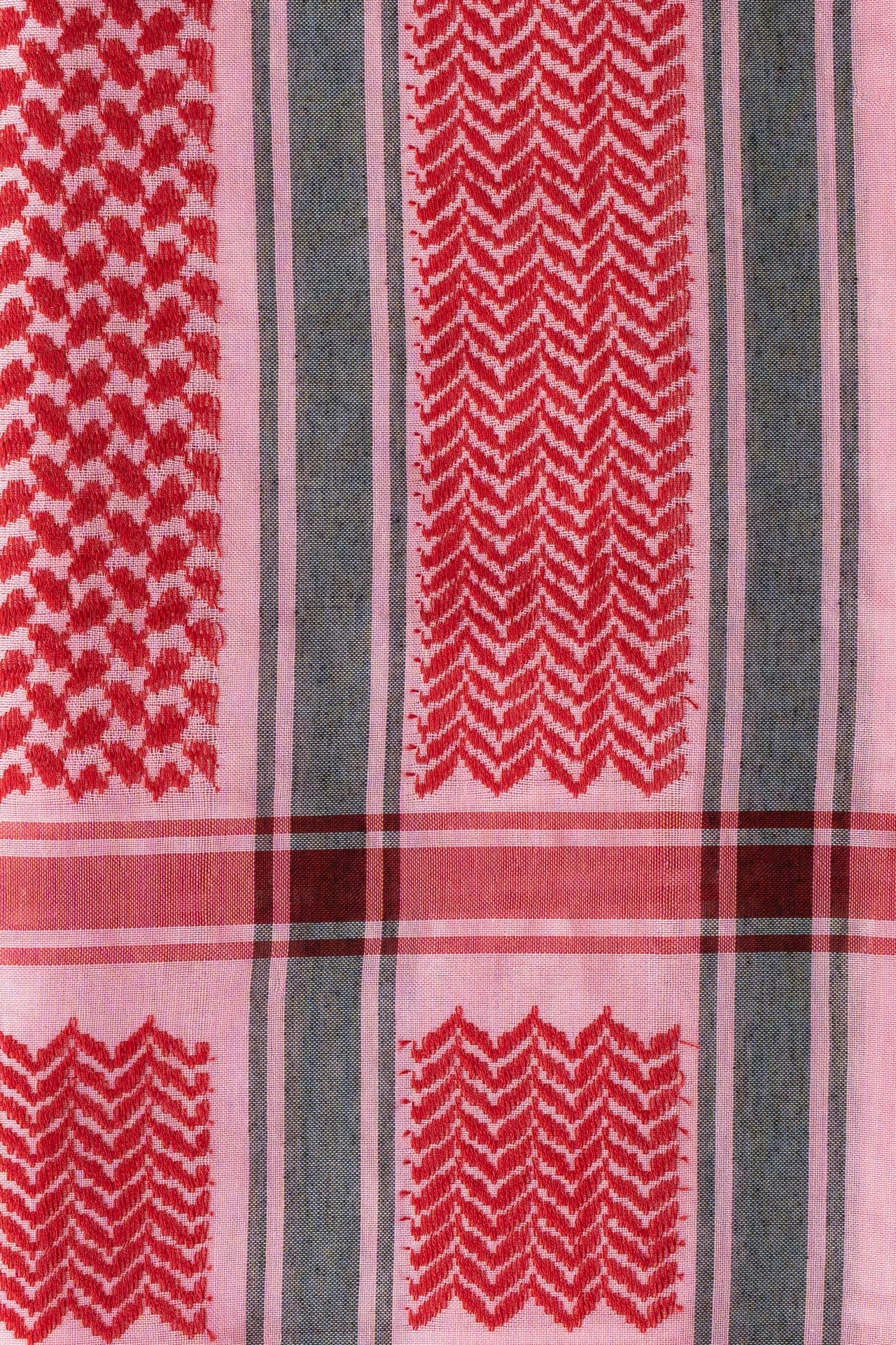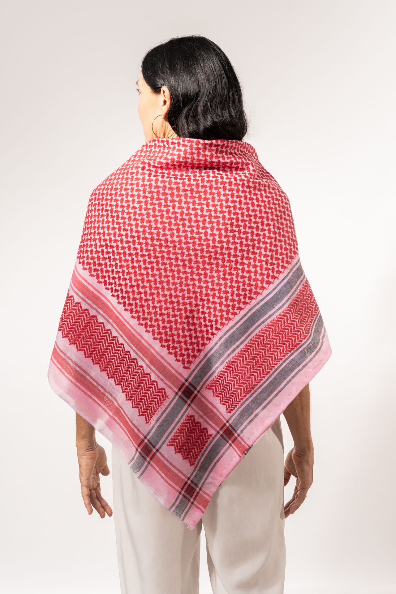 La kufiya (también conocida como kuffiyeh o hatta) es el pañuelo tradicional palestino, usado durante siglos para protegerse del sol, el frío y la arena del desierto. Desde los años 60 se ha convertido en un símbolo mundial de resistencia y apoyo al pueblo palestino. Su diseño encierra un profundo significado: